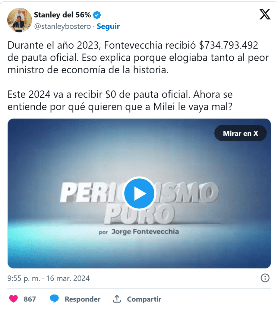 La interrupción de la propaganda oficial decidida por Balcarce 50 sobre fines de 2023 fue, a criterio del presidente Javier Milei, la causa de la particular columna del director del grupo.