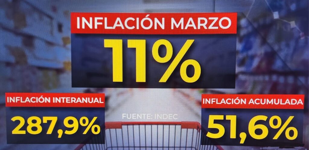 La inflación desaceleró, en marzo, por tercer mes consecutivo, se ubicó en el 11% (levemente por encima de lo que anticipó el ministro de Economía Luis Caputo) y ya lleva acumulado el 51,6% en lo que va del año. Por su parte, en la comparación interanual, el incremento alcanzó el 287,9%, la más alta en 33 años, según informó este viernes 12 de abril el Instituto Nacional de Estadística y Censos (INDEC).