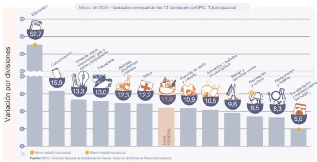 El IPC registró un alza mensual de 11% en marzo, y acumuló una variación del 51,6% en lo que va del 2024. En la comparación interanual, alcanzó el 287,9%. La división de mayor aumento en el mes fue Educación (52,7%).