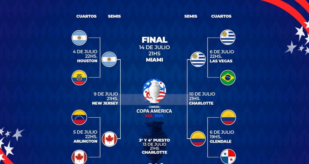 Los vencedores de esos enfrentamientos sacarán el boleto para la gran final que está pautada para el domingo 14 de julio en el Hard Rock Stadium de Miami. Los perdedores disputarán el partido por el tercer puesto el día previo, el sábado 13, en el Bank of America Stadium de Charlotte.