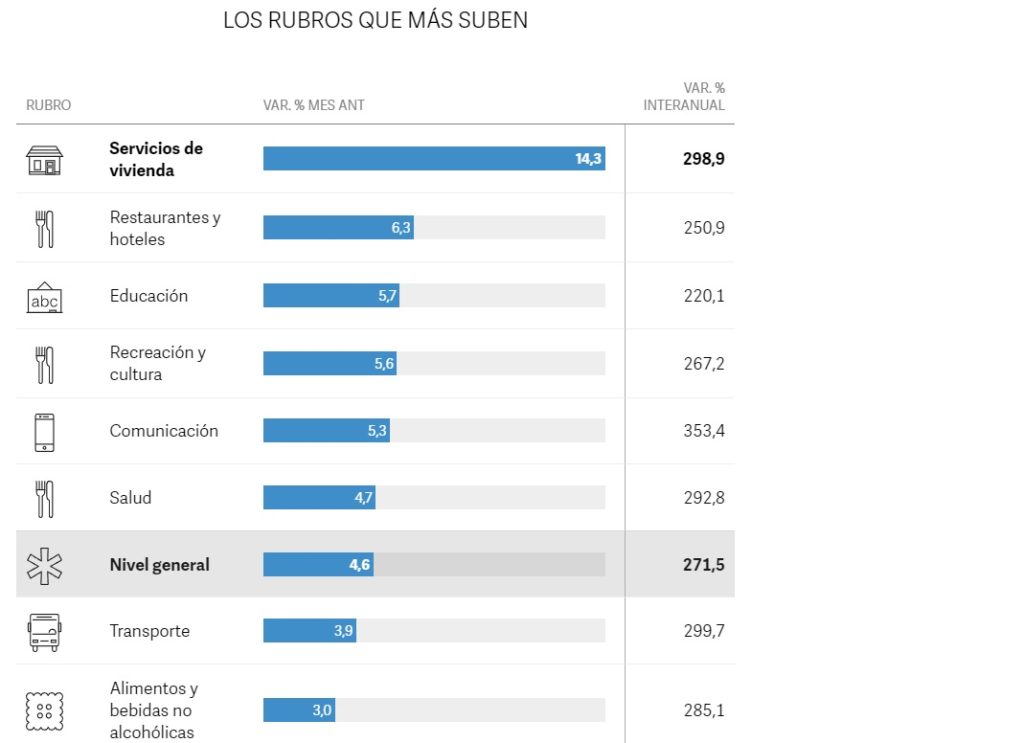 «La división de mayor aumento en el mes fue Vivienda, agua, electricidad, gas y otros combustibles (14,3%), por las subas en las tarifas de electricidad y gas y en alquiler de la vivienda. Le siguieron Restaurantes y hoteles (6,3%) y Educación (5,7%) por subas en todos los niveles de enseñanza», fue la explicación del INDEC.