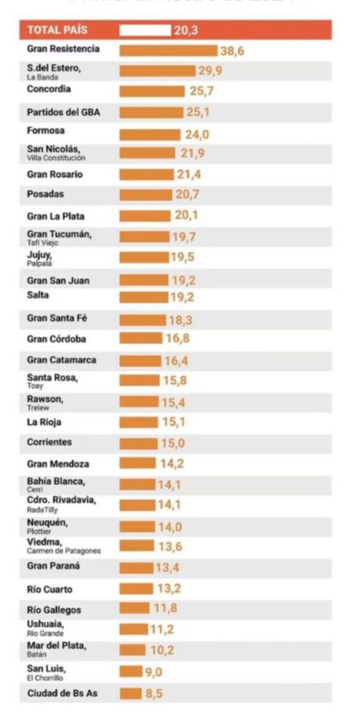 Con los datos oficiales del Indec, y por aglomerado urbano, las estimaciones de la UCA ubican a la región de Gran Resistencia, Chaco, como la más pobre del país con una tasa del 79,5%. La indigencia alcanza al 38,6% de la población. Le sigue Formosa con un 72% de pobres y Santiago del Estero- La Banda con casi 30% de indigentes. Pero la mayoría de las regiones tienen niveles de pobreza por encima del 50% y del 15%, en el caso de la indigencia. Las tasas de pobreza e indigencia del Conurbano Bonaerense, son del 62% y 25%, respectivamente.